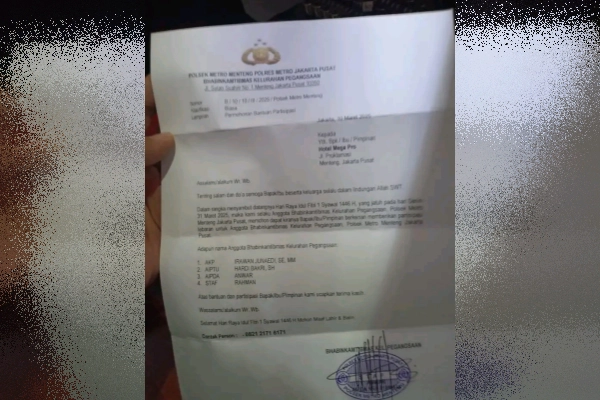 Dalam foto yang beredar, surat dengan kop resmi yang dikirim oleh Bhabinkamtibmas Kelurahan Pegangsaan, Polsek Metro Menteng, Polres Metro Jakarta Pusat itu ditujukan kepada pimpinan Hotel Mega Pro di Jakarta Pusat dengan maksud meminta bantuan partisipasi untuk menyambut Hari Raya Idul Fitri 1446 H yang jatuh pada 31 Maret 2025.