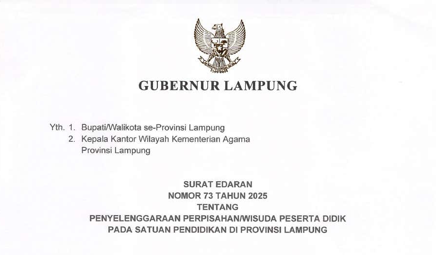 Hal itu, tertuang dalam Surat Edaran Gubernur Lampung Nomor 73 Tahun 2025 tentang Penyelenggaraan Perpisahan/Wisuda Peserta Didik pada Satuan Pendidikan di Provinsi Lampung. Surat edaran yang ditujukan ke Bupati/Walikota se-Provinsi Lampung dan Kepala Kantor Wilayah Kementerian Agama Provinsi Lampung yang tandatangani oleh Gubernur Lampung pada 10 April 2025.