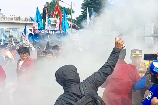 Aksi dorong mendorong mewarnai peringatan Hari Buruh Internasional (May Day) 2025 di depan Gedung DPR RI, Kamis (1/5/2025). (Istimewa)