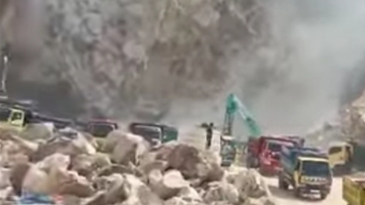 Dari pantauan di lokasi, nampak puluhan truk pengangkut material batu terjebak di area yang tertimbun longsoran.